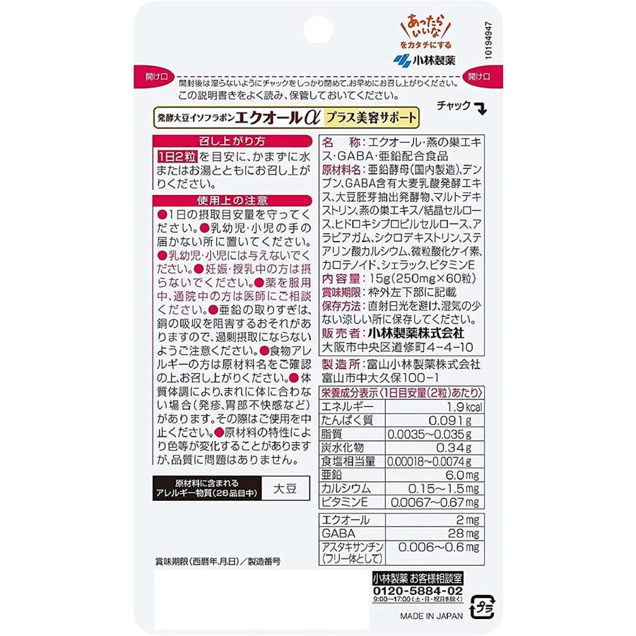 エクオールと健康・美容サポート成分配合サプリ GABA、亜鉛、燕の巣、アスタキサンチンが女性の健康と美容をサポート 名称 エクオール・燕の巣エキス・GABA・亜鉛配合食品 内容量 15g(250mg×60粒) 原材料 亜鉛酵母(国内製造)、デンプン、GABA含有大麦乳酸発酵エキス、大豆胚芽抽出発酵物、マルトデキストリン、燕の巣エキス/結晶セルロース、ヒドロキシプロピルセルロース、アラビアガム、シクロデキストリン、ステアリン酸カルシウム、微粒酸化ケイ素、カロテノイド、シェラック、ビタミンE 使用上の注意 ●1日の摂取目安量を守ってください。