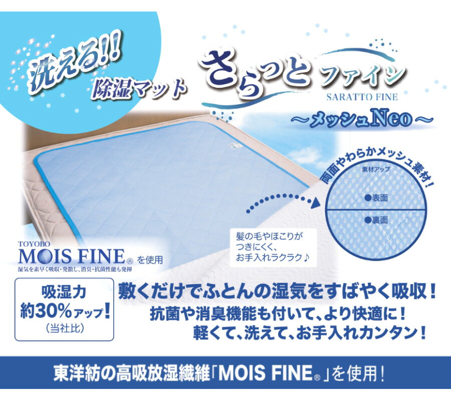 【リアルタイムランキング1位!2/25】 洗える!!除湿マット さらっとファインメッシュNEO 除湿マット 寝具 ビリケン 日本製 丸洗い 湿気 吸収 消臭効果 東洋紡 NEW
