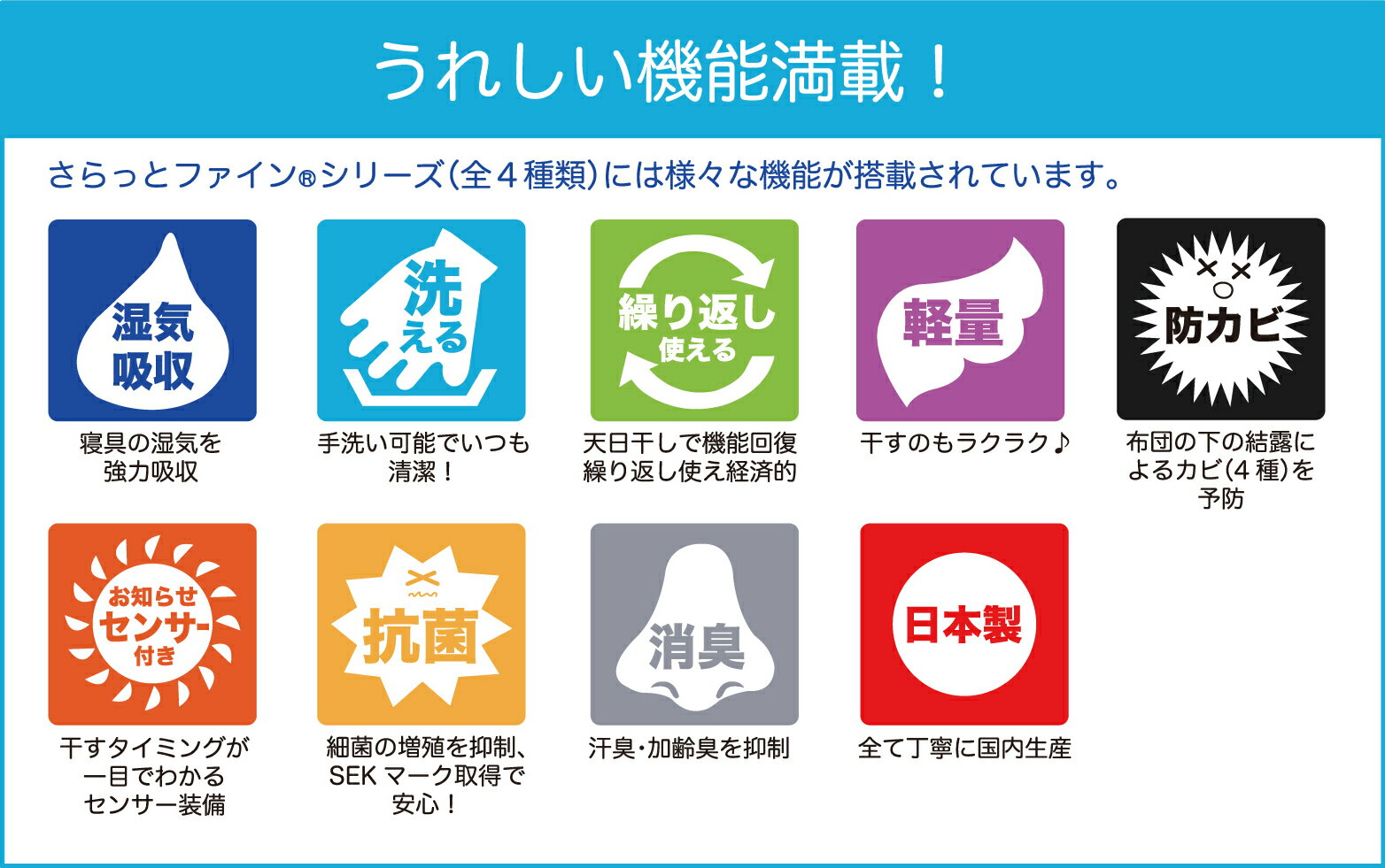 品質表示 サイズ 約90×180cm(シングルサイズ) 組成 表地:ポリエステル100% メッシュ地 中材:ポリエステル60% 合成繊維(モイスファイン)40% 裏地:ポリエステル100% メッシュ地 機能性 高吸湿、抗菌、消臭(アンモニア・酢酸)、防カビ 取扱い方法 洗濯機(ネット使用)・ドライクリーニングOK(洗濯表示に従ってお洗いください) 製造 日本製 商品のポイント ・ 吸湿性能が最大で乾燥剤シリカゲルの2~3倍、綿の約8倍もあり 、 吸湿性能と同等の放湿性能を併せ持つ東洋紡の高吸放湿繊維「モイスファイン®」を使用しているため 、その結果優れた調湿機能も発揮。